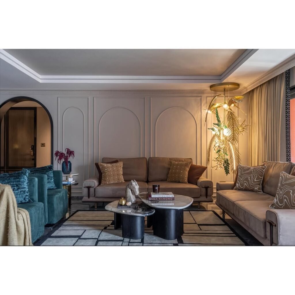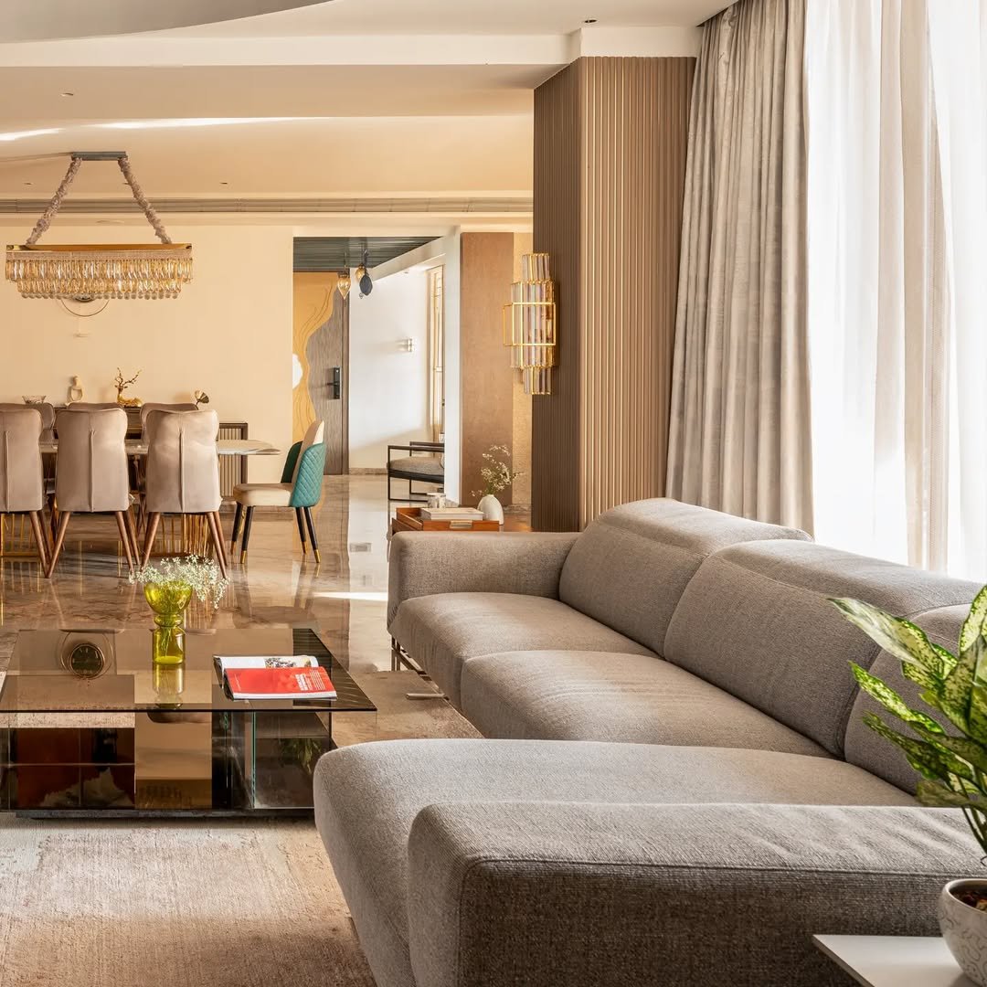 “The living room feels elegant and luxurious with its warm, earthy tones, modern minimalistic elements, and abundant natural light. The space is fresh, inviting, and perfectly balanced.”